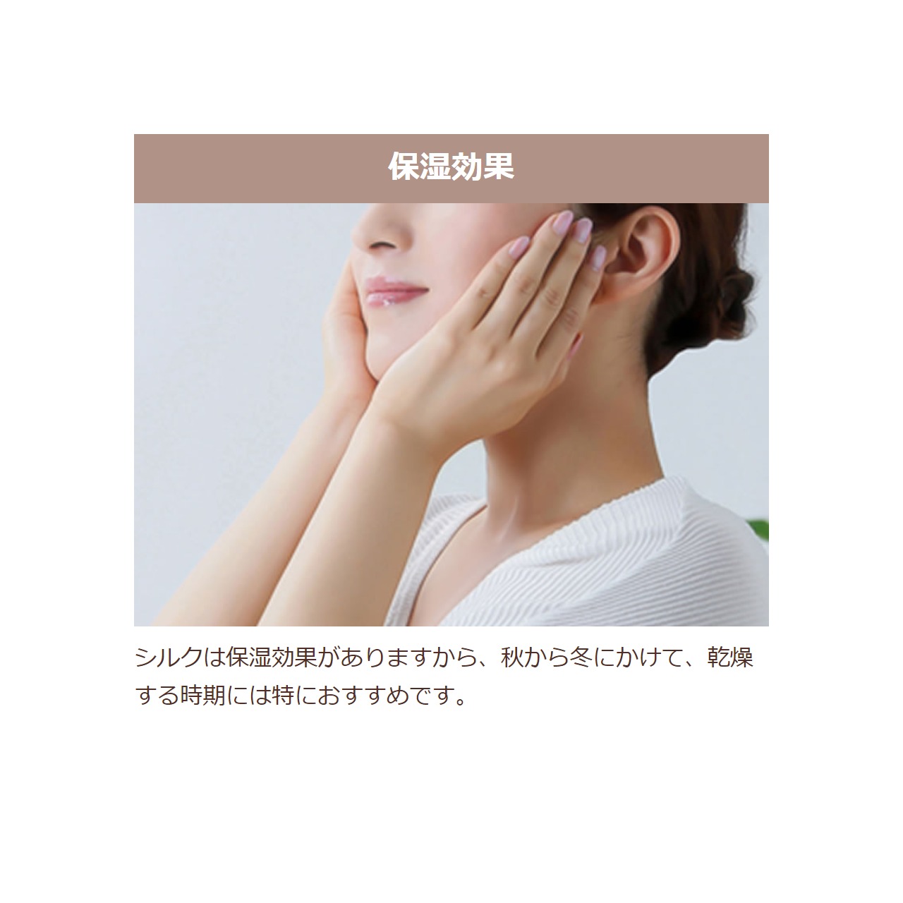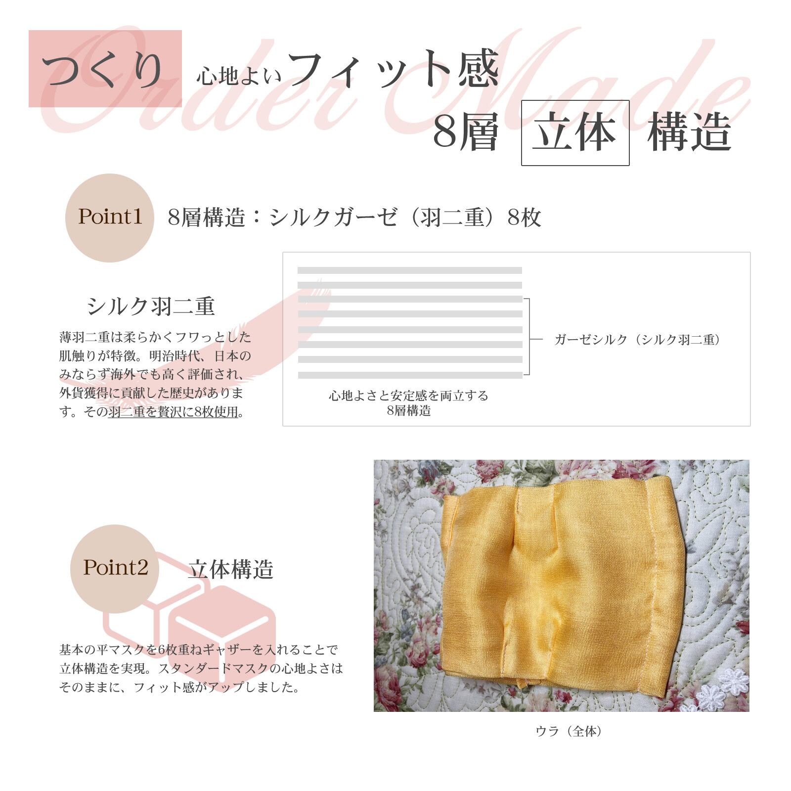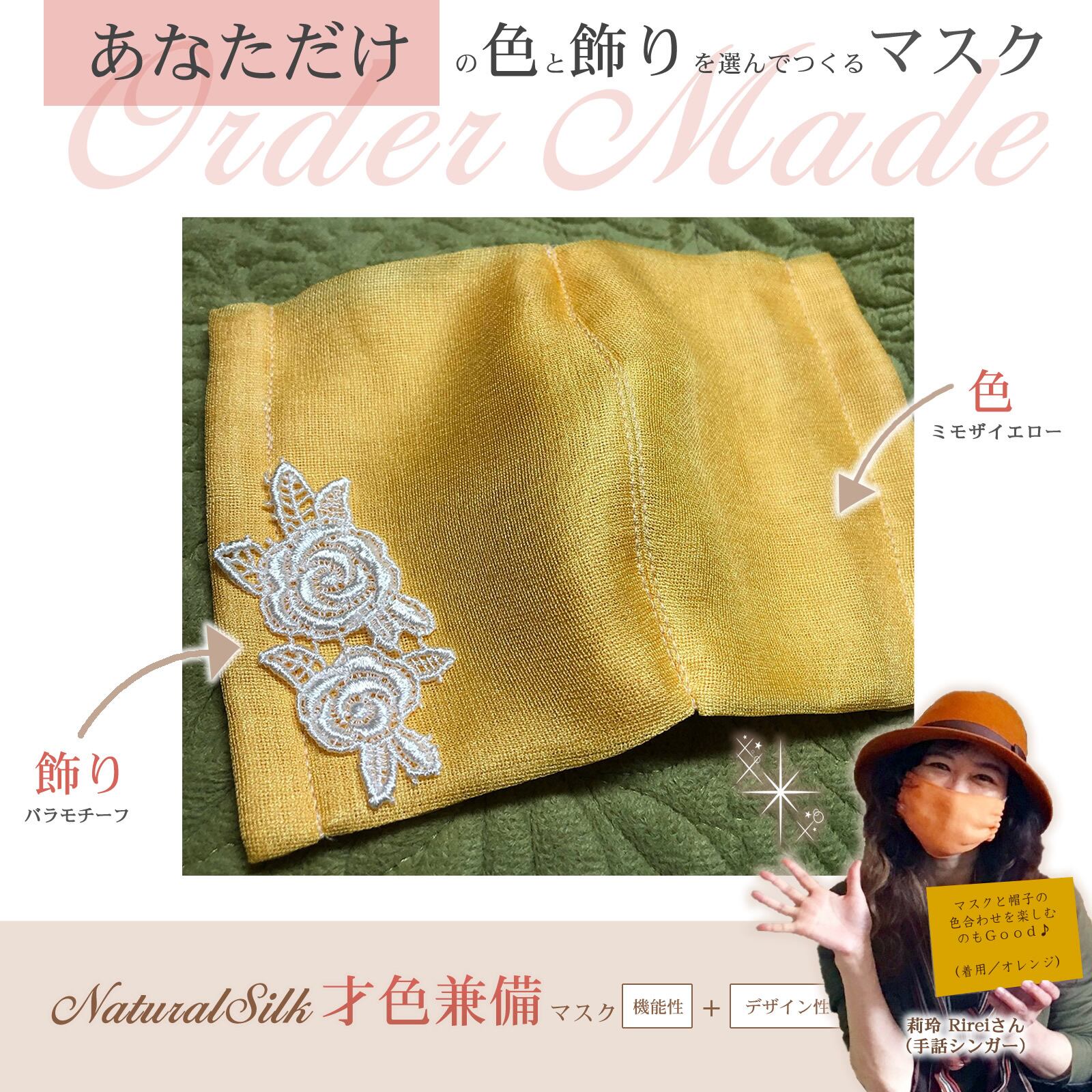 天然シルクには見た目の美しさはもとより、健康と美容に嬉しい効果が多くあります。例えば、抗菌性や保湿性などなど。なかでも息の成分アンモニアを付着させる効果に優れていますので、快適な使用感が大きな特徴の一つです。その天然シルクをふんだんに使用したマスクに、デザイン性をプラスしたのが、こちらの「プレミアム天然シルク才色兼備マスク」なのです。