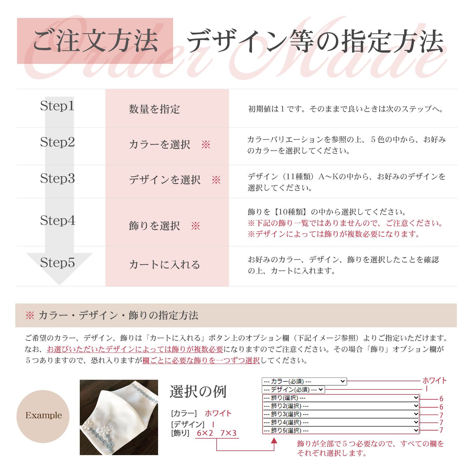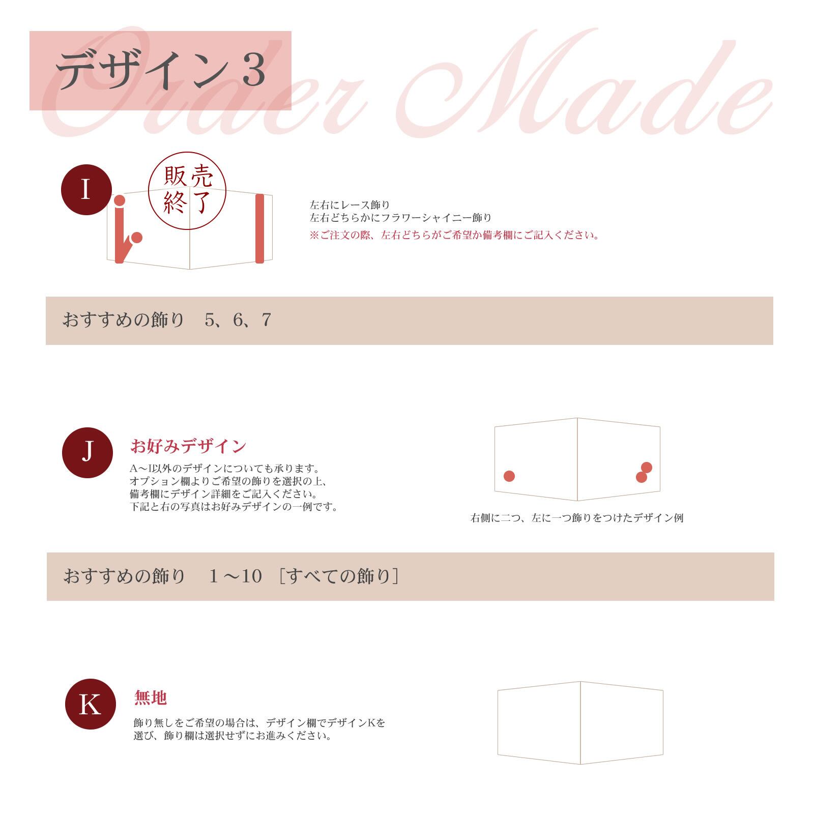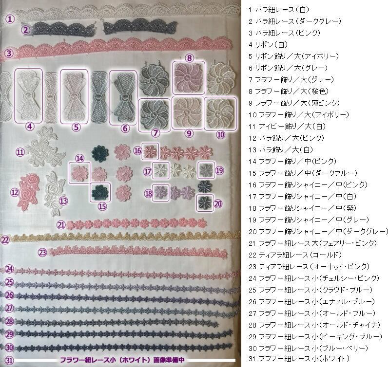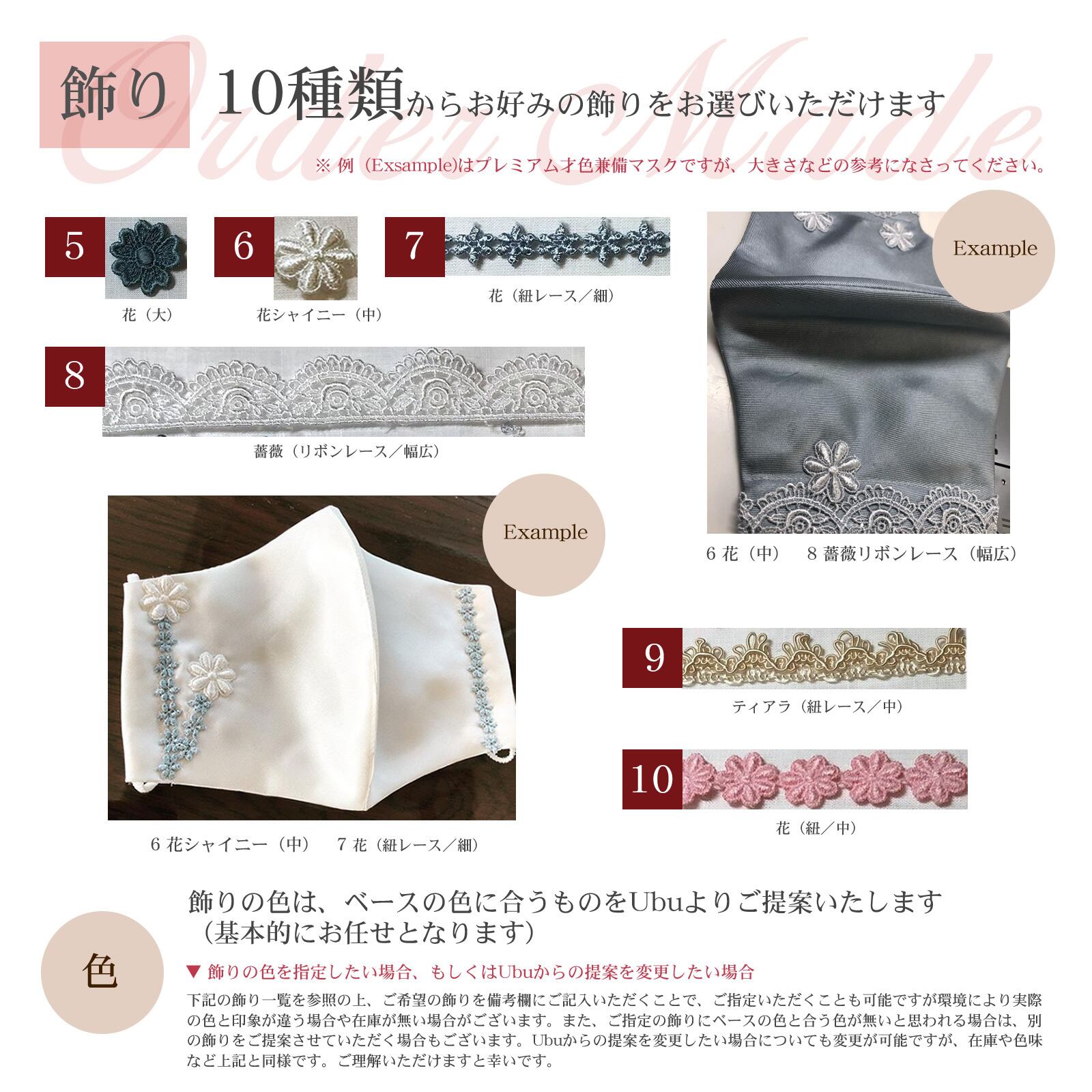 10種類よりお好みの飾りをお選びいただけますが「色」は基本的に「おまかせ」となります。特定の色を指定したい場合、もしくはUbuからの提案を変更したい場合のみ一覧※をご参照くださいますようお願いします。
