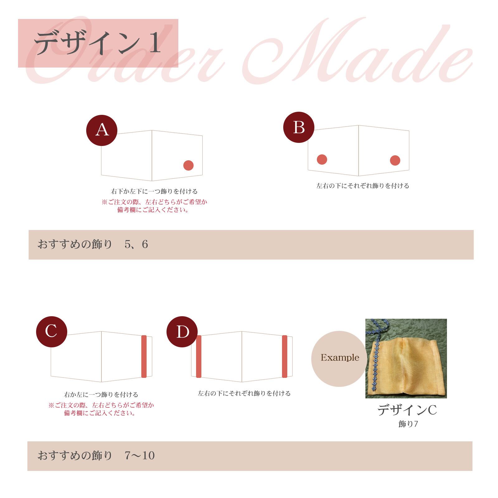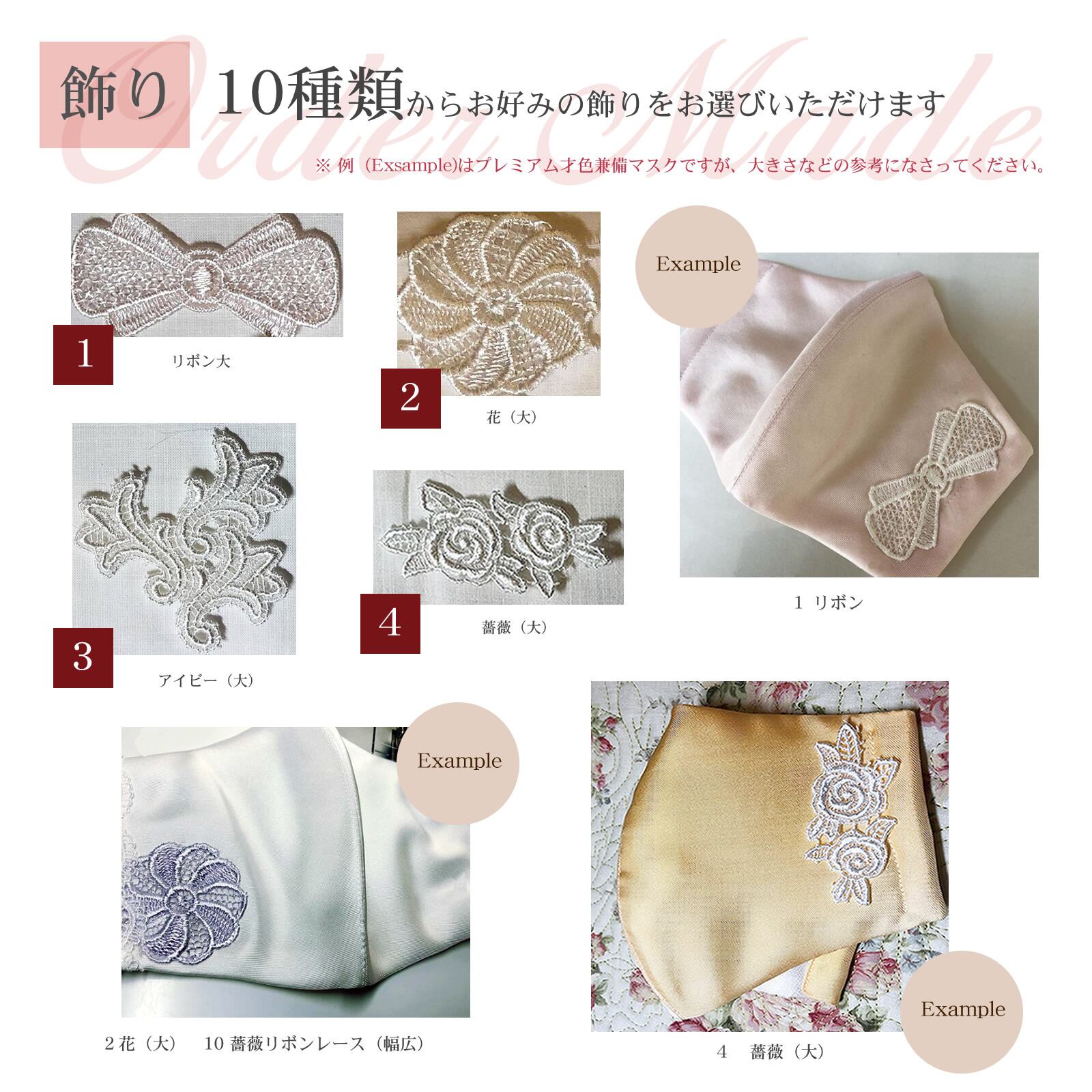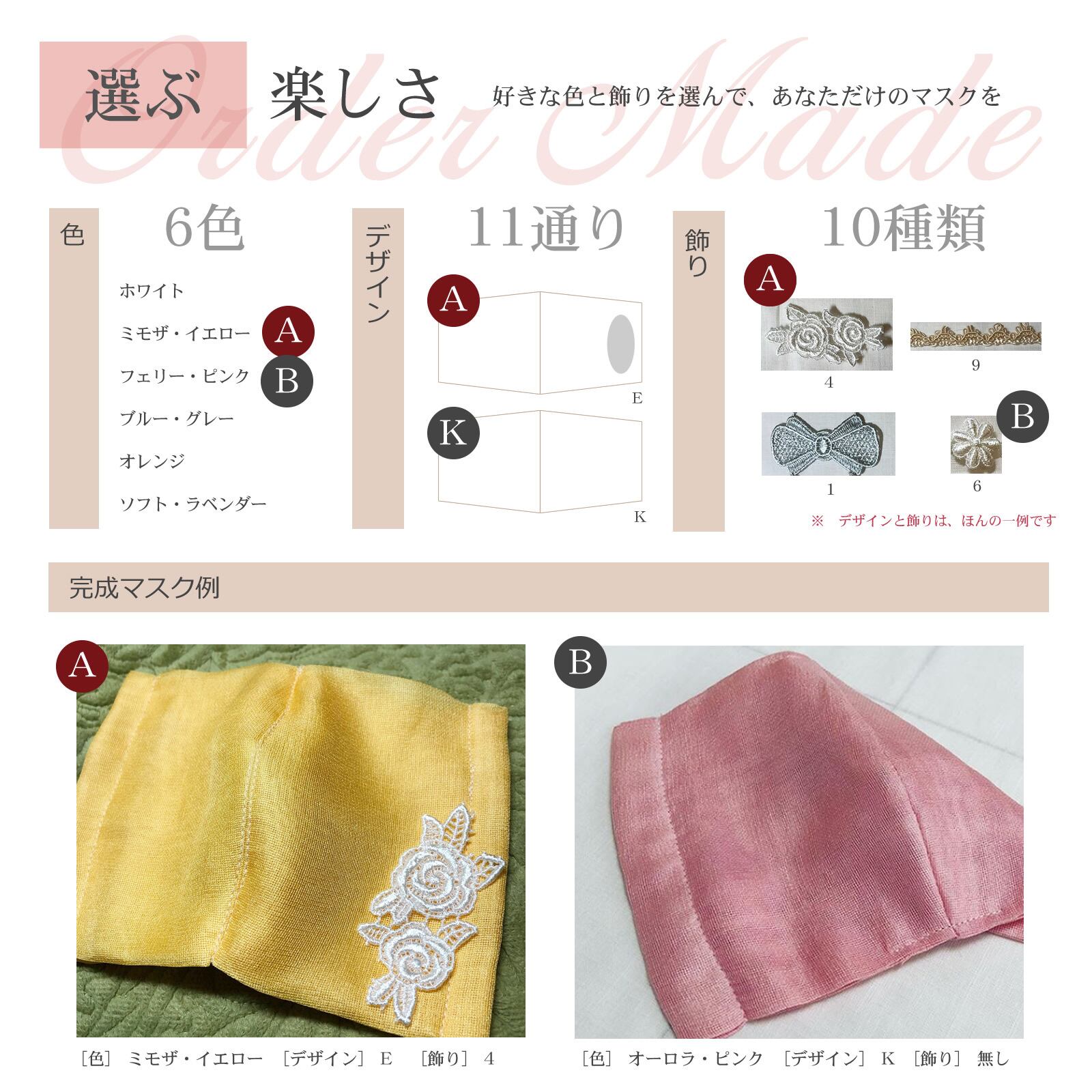 10種類よりお好みの飾りをお選びいただけますが「色」は基本的に「おまかせ」となります。特定の色を指定したい場合、もしくはUbuからの提案を変更したい場合のみ一覧※をご参照くださいますようお願いします。